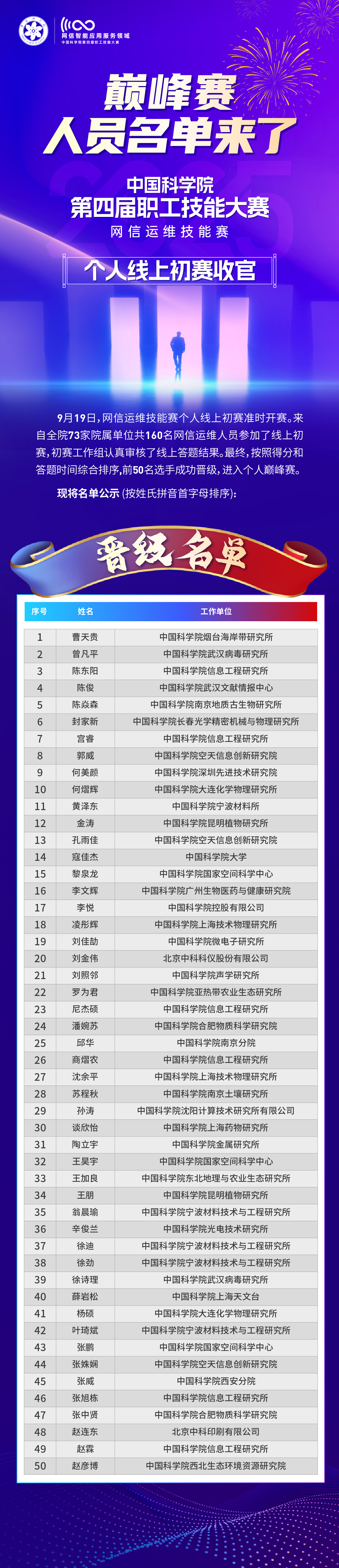 中国科学院第四届职工技能大赛网信运维技能赛个人线下决赛十强名单
