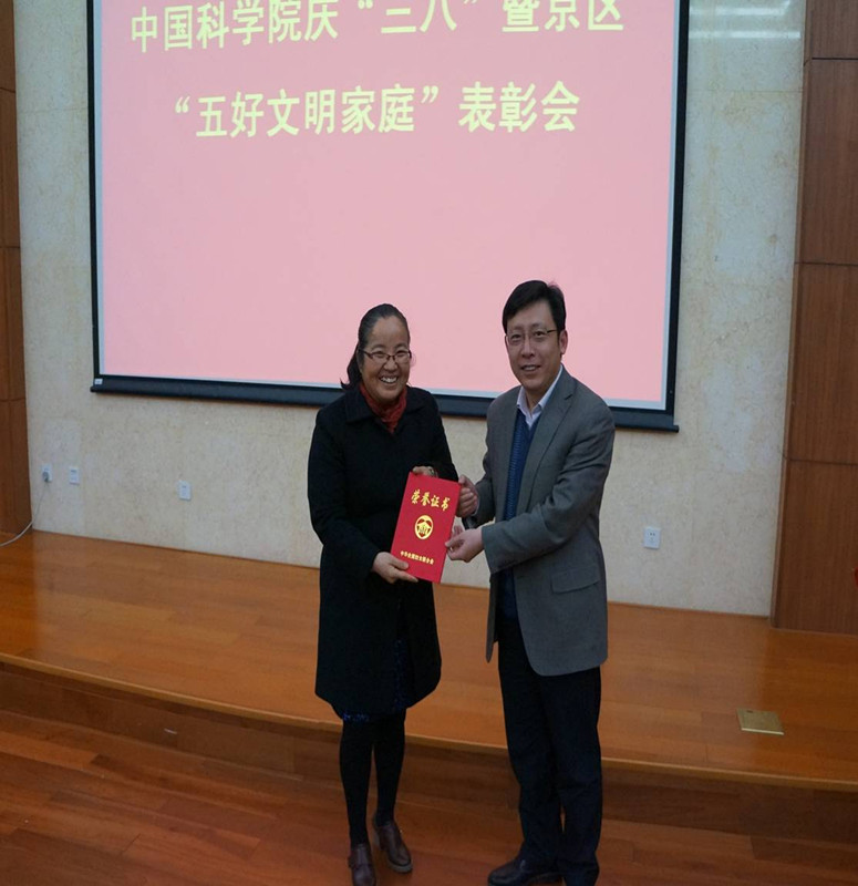 2014年,院妇工委按计划在京区广大职工中开展了“五好文明家庭”的评选工作,经过初审和评选,网络中心王小宁等15个职工家庭获得京区“五好文明家庭”的称号。同时,在院妇工委的大力推荐下,动物所乔格侠研究员的家庭被评为“全国五好文明家庭”,得到了全国妇联的表彰。会上,院妇工委副主任、学部工作局局长李婷宣读了表彰决定;院妇工委副主任、心理所所长傅小兰,院妇工委副主任、中科集团党委副书记秦怡为获得表彰的京区家庭颁奖。房自正副书记为乔格侠研究员颁发了全国妇联授予的奖牌和证书。表彰活动后,古脊椎所刘仲云等4位获奖家庭的代表做了经验发言,2014年中央国家机关妇工委“家庭建设好经验”活动“最佳经验”奖获得者、微电子所的尚长宏也受邀分享了家庭子女培养教育的心得和体会。温馨的气氛、生动的经验介绍使会场时时爆发热烈的掌声和笑声。