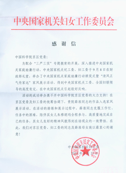 在“清风正气传家远”家庭助廉主题活动开展过程中,我院京区党委高度重视、京区纪委和院妇工委及时布置,共收到各项材料200多份。院妇工委举荐院部机关薛淮同志作品,并在颁奖式上做了现场展示。中央国家机关妇工委发来感谢信,对京区党委的大力支持、对我院妇工委的扎实推动、对薛淮同志的认真参与,表示了衷心的感谢。