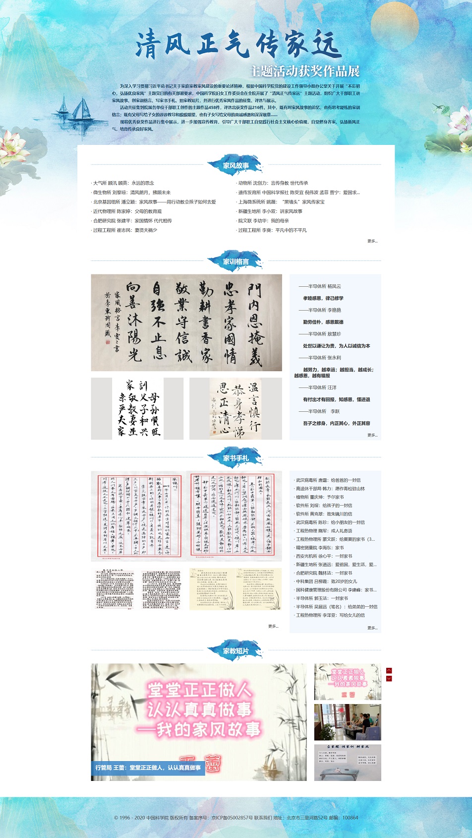 自活动开展以来,院属各单位高度重视,广大干部职工踊跃创作,活动共征集到家风故事、家训格言、家书手札、家教短片等4类作品458件。其中,既有对家风故事的追忆,也有思考凝练的家训格言,既有父母写给子女的谆谆教导和殷殷期望,也有子女写给父母的真诚感激和深深敬意……充分展现出中科院干部职工弘扬中华优秀传统文化、争做家风建设表率的良好精神风貌。