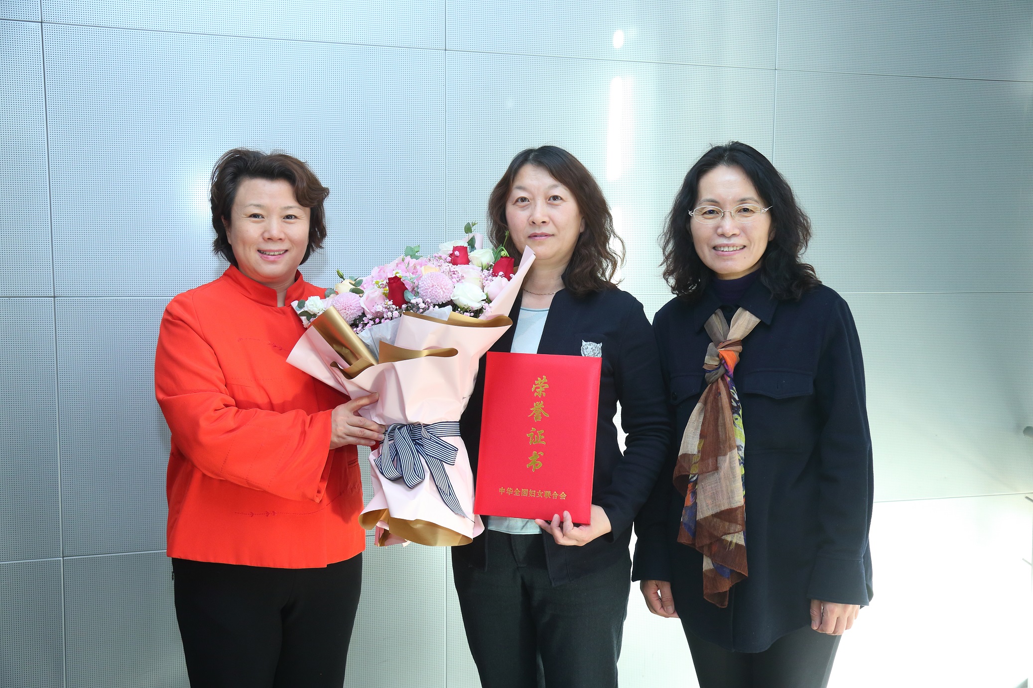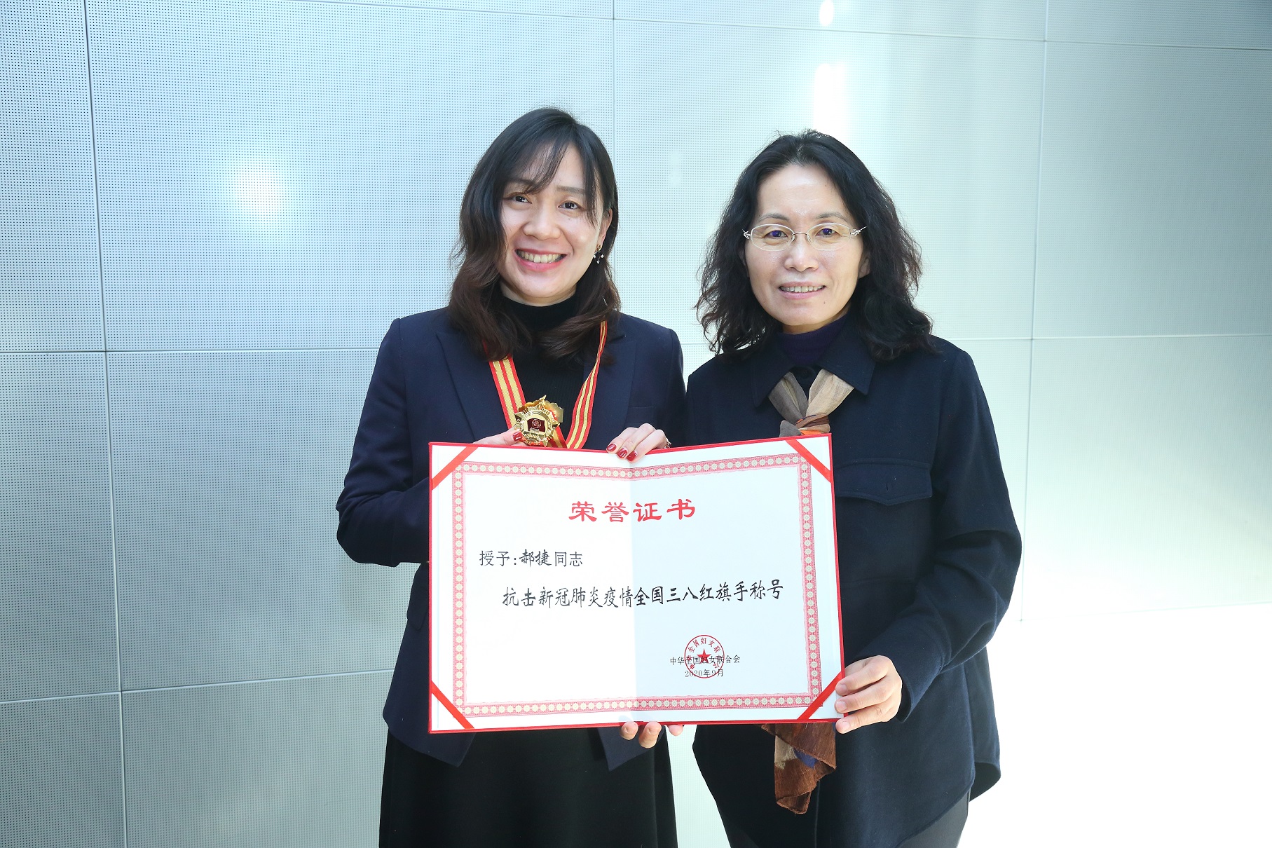 为郝捷颁发“抗击新冠肺炎疫情全国三八红旗手”奖章和证书