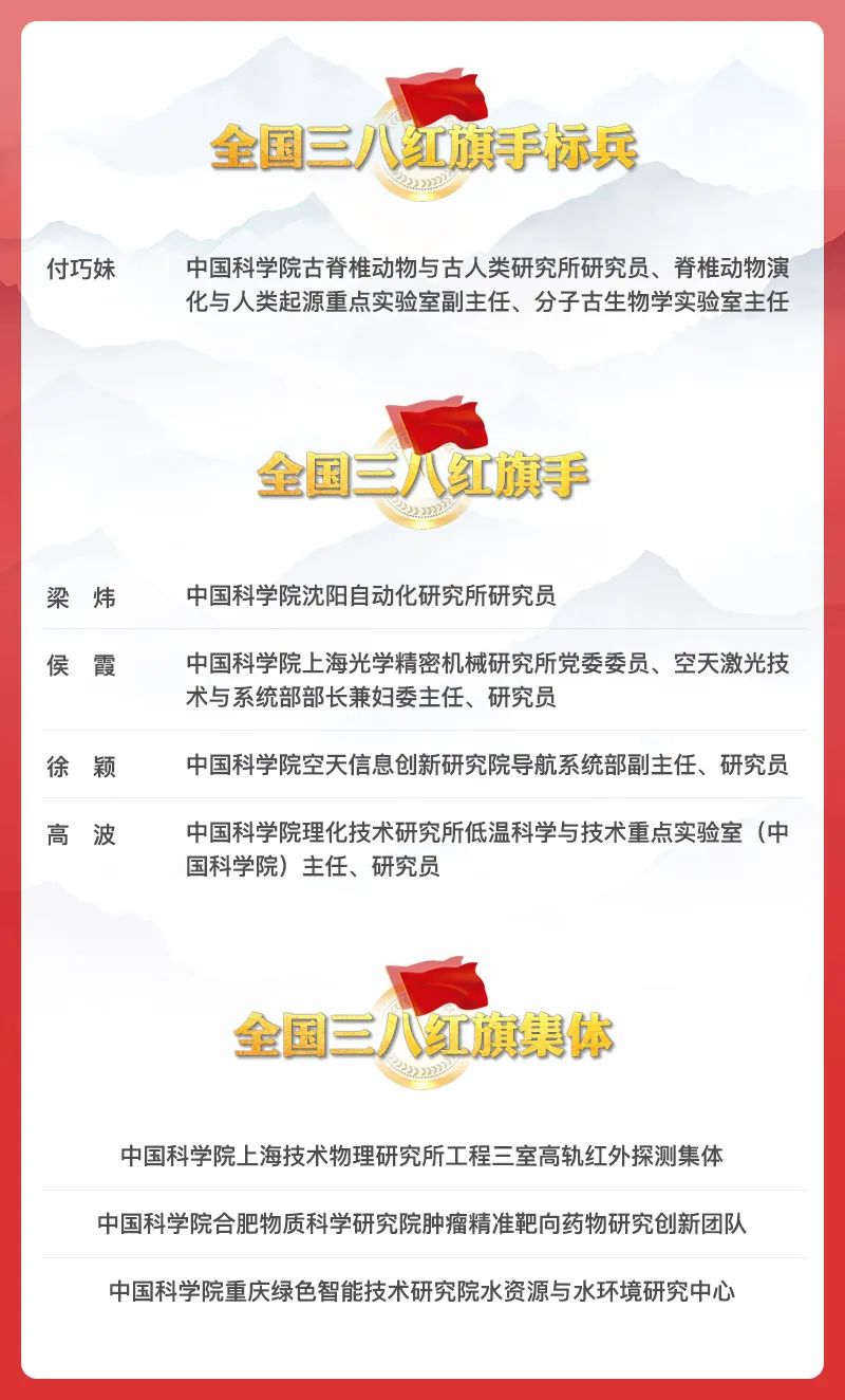 3月3日,全国妇联在京举行纪念“三八”国际妇女节暨表彰大会,大会表彰了2023年度全国三八红旗手标兵、全国三八红旗手、全国三八红旗集体。中国科学院共有5名个人、3个集体受到全国妇联表彰。