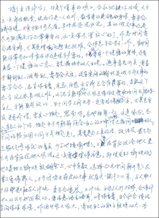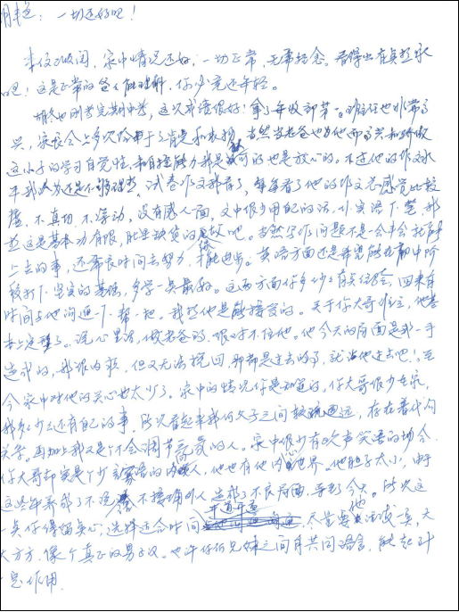 来信已收阅,家中情况还好,一切正常,无需挂念。看得出有点想家吧!这是正常的,爸爸能理解,你毕竟还年轻。