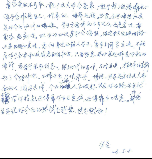 接下来谈谈你了,你是个懂事的孩子,全家就数你活泼大方,这一点我很欣赏。现在你是一人在外,最重要的是注意好身体,要学会自我保健,伙食方面不可太省,平时老爸说归说,真的做起来还是尽可能满足你正常需要的,这一点你尽管放心好了。作息时间要合理安排,尤其是睡眠问题自己把握,会休息才会学习、工作。有时间能经常参加体育活动还是很有必要的。不仅要有一个健康的身体,还要具备一个健康的心态,要充满快乐的人生观。遇事要想开点,要善于剖析自己,调整自己,要学会大度,没有宽阔的胸怀是做不成大事的。要学会忍,忍字很重要,先忍,后想去分析总会有良策的,当然这个忍字说之容易做之难,这个忍字能很好运用还得经过漫长时间去磨练自己,才能显成效的。至于同学之间关系一定要搞得融洽一点,尤其是室友,更要珍惜,要真心相处。各地相聚一起,这是缘分。各人有各人的个性,相处中不可能都符合自己的性格。所以不同性格应用不同方式相处。真要是处不来的话,俗话说,惹不起,还躲不起吗?咱就让着点,少与他接触罢了。不要在背后议论他人,更不可在背后说他人坏话,这一点要值得注意。即使发生不愉快的事,也不要把不愉快写在脸上,心中有数,选择合适时间解决是了,尽量不要得罪人。不可因鸡毛蒜皮的小事就眉头一皱计上心来,与人耿耿于怀,更不能与人记仇,要学会宽容。主动与人打招呼,会得到他人的认可和回敬的。要注意语言培养,口才很重要,当今社会谈话学问很深很深,作用也很大很大,要把自己的胆子锻炼得大一些。虚荣爱面不可取,敢于在大场合亮相,敢于跟上级接触谈心。要学会推荐自己,修养自己,培养气质等等。这些我想应该是你今后必修的课。学习方面我就不多说了,还是套话,需勤奋刻苦。把学的知识与社会接轨,理论与实践相结合,这是真理。要向身边的能人学习,要多与同学交流,不能局限于书本和校园,要面向社会,只要留意,每时每处都是你学习的场所。要善于收取信息,跟上时代的步伐,与时俱进,才能勇往直前。好了这些话正确与否,只供参考。胡艳,老爸是未经过大世面的人,阅历太浅。今后你的人生坐标以及你得路,老爸就无能给你指点了,还得靠你自己定位,还得靠你自己去走。