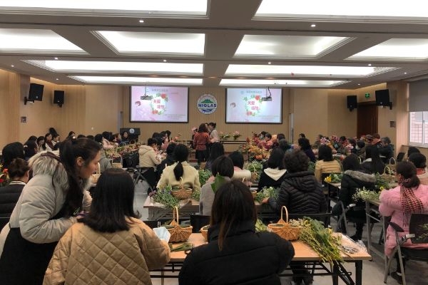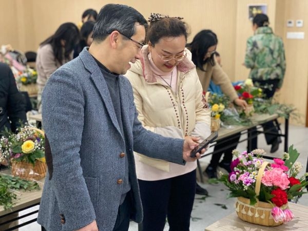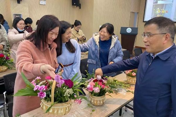 “关爱-绽放”活动现场,女职工学习插花技法