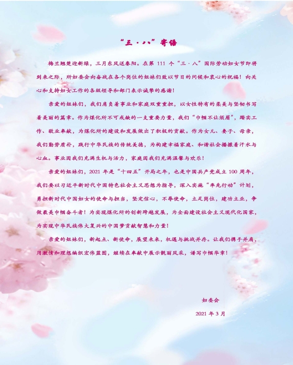 “三八”前夕,妇委会深情书写寄语,为女同胞送去节日的祝福,鼓励女职工立足本职、扎实工作、扬帆新征程,不忘初心跟党走,牢记使命建新功,继续在奉献中展示靓丽风采、谱写巾帼华章!