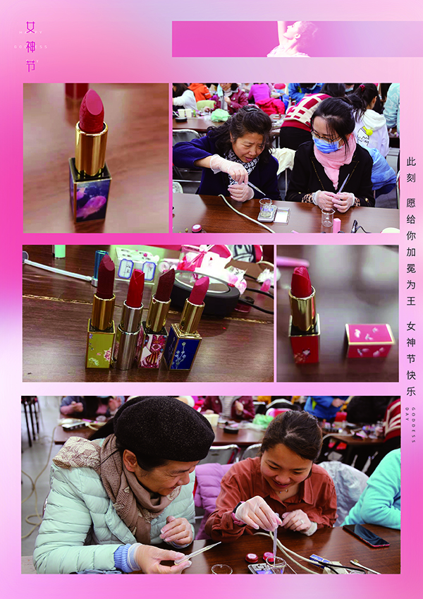 在创意插花活动中,大家不仅学习了花卉认知小知识,还自己动手搭配出漂亮的网红牛皮纸袋插花,在美丽的花影与馥郁的花香中增进了交流,愉悦了心情;服饰搭配教学邀请了专业形象老师授课,通过活动,与会人员不仅学习了服饰色彩搭配知识,还解锁了丝巾搭配的小技巧,为点亮一个更自信的自己提供了灵感;在甜品制作活动中,大家一起打发奶油,为自己的甜品摆出形状各异的造型,品尝到的是一样的甜蜜和节日的喜悦;精油唇膏制作考验着参与者的耐心和动手能力,但是当拿到自己动手制作的国潮口红的那一刻,“惊喜”成为很多参与者的第一感受。