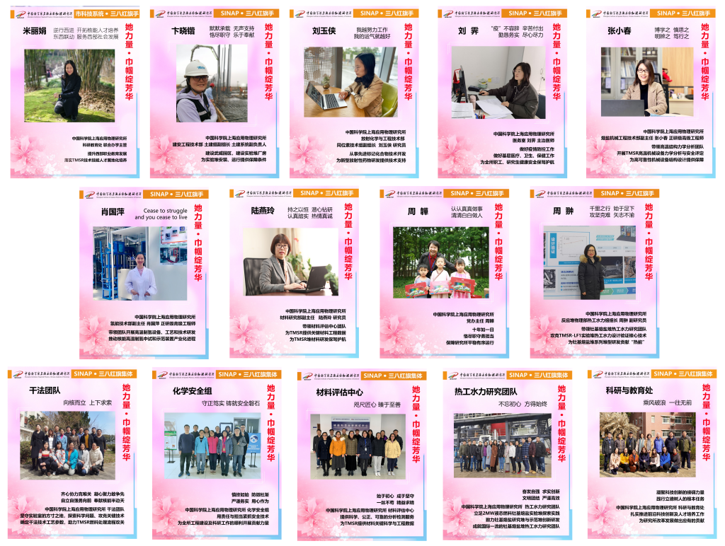 同时,上海应物所在2月至3月期间积极开展所内评选表彰,经基层妇女小组酝酿推荐、评选小组考评、党委会研究,卞晓锴、刘玉侠、刘霁、张小春、肖国萍、陆燕玲、周韡、周翀等8人荣获2019-2020年度所级“三八红旗手”,干法团队、化学安全组、材料评估中心、钍基熔盐堆热工水力研究团队、科研与教育处等5个集体荣获2019-2020年度“三八红旗集体”。