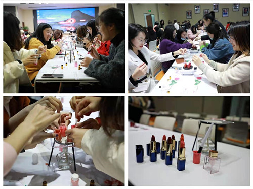 最令人“唇唇”欲动的莫过于第二环节口红DIY制作了,大家对桌子上各种制作材料充满了好奇,期待着能亲手制作出心仪的口红。将色粉和精油倒入烧杯充分搅拌、加蜡加热——这可难不倒常年奋战在实验室的我们,大家都以平时做实验的专注精神,娴熟地挥动着手里的搅拌刷和搅拌棒,不少人还充分发挥善于创新的劲头,主动寻找不同颜色的色粉,在基础颜色上进行改良,将“原创精神”进行到底。随着一支支口红顺利脱模,博思会堂响起了此起彼伏的赞叹声。看着亲手制作的堪比国际大牌的口红,大家充满了成就感!