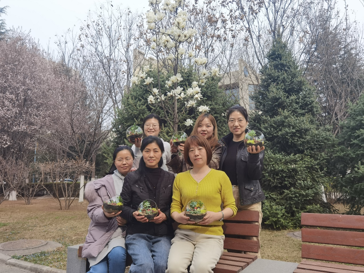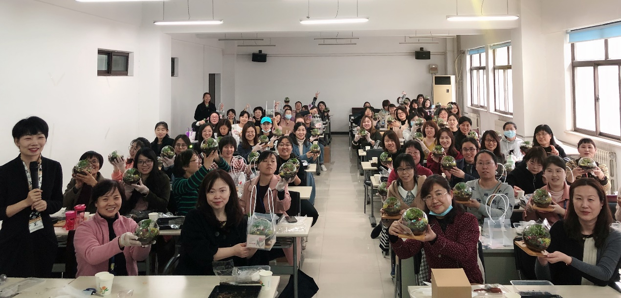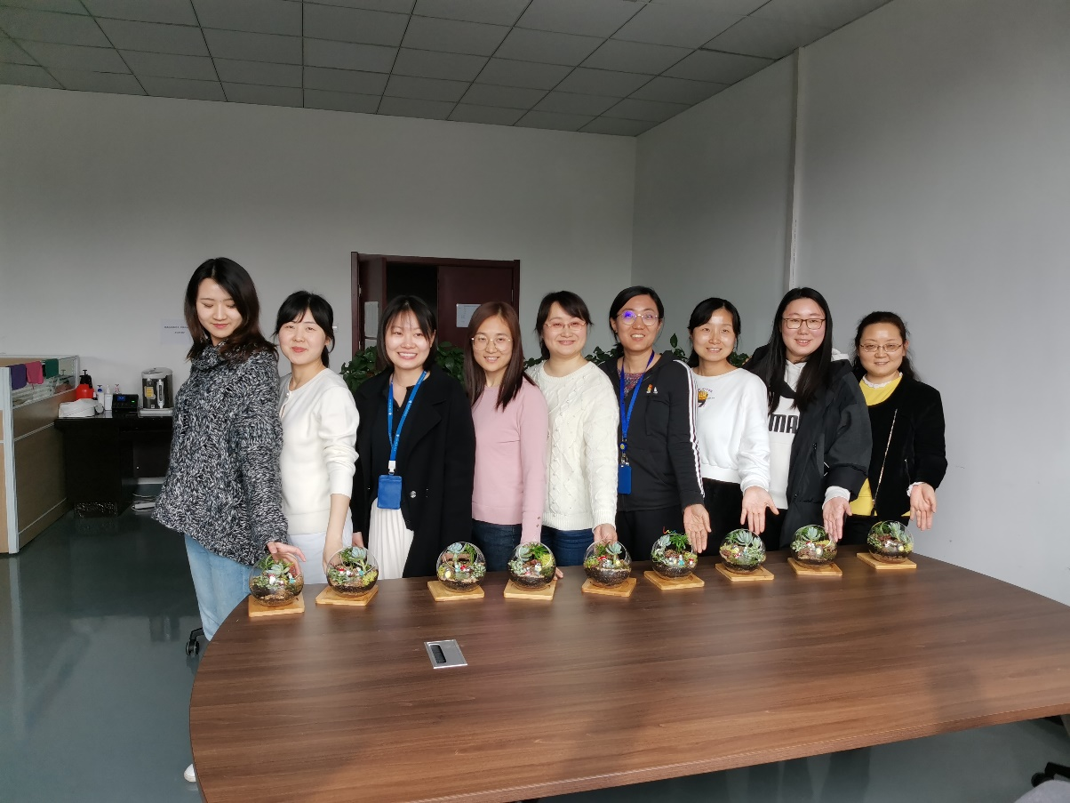 2021年3月5日中午,七十余名女职工在花艺老师的引领下,亲手尝试将多肉植物、苔藓植物和造景玩偶进行组合,在晶莹剔透的玻璃瓶中,布设错落有致的景观。方寸之间,开辟一个充满温情与自然气息的花草世界,凝聚无限创意与生活情趣。