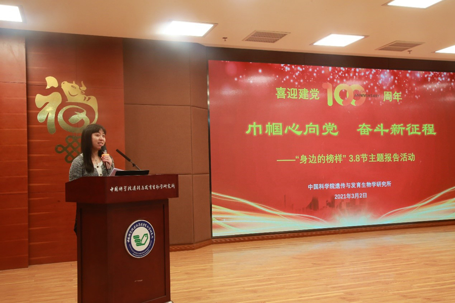 新春伊始,万物复苏。在这最美的季节里,我们又迎来了一年一度的“三八”国际劳动妇女节。为庆祝中国共产党成立100周年,响应全国妇联和院妇工委关于开展“巾帼心向党 奋斗新征程”活动的号召,2021年3月2日,中国科学院遗传与发育生物学研究所妇委会举办“身边的榜样”三八节主题报告活动。活动邀请研究所杰出女性代表曹晓风院士和申倚敏书记做分享报告,为研究所的姐妹们带来了一场关于成长与智慧的心灵盛宴。期望通过展示身边女性的巾帼风采,激励研究所女性不忘初心、砥砺前行。活动由遗传发育所妇委会主任王秀杰研究员主持,研究所百余位女同胞参与活动。