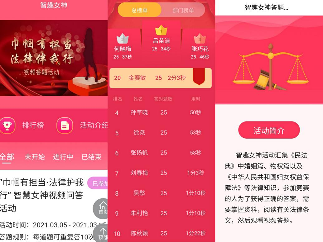 为进一步丰富女职工的业余文化生活,提高女职工权益保护法律法规知识的知晓率、普及率,妇委会组织女职工学习《民法典》婚姻篇、物权篇相关法律知识,引导女职工尊法、学法、懂法、用法,提高女职工的自我保护意识和维权意识。并且开展了以“巾帼有担当·法律护我行”为主题的智慧女神视频知识竞答活动,该答题活动共吸引了176名女职工参加,参与率达到92%。