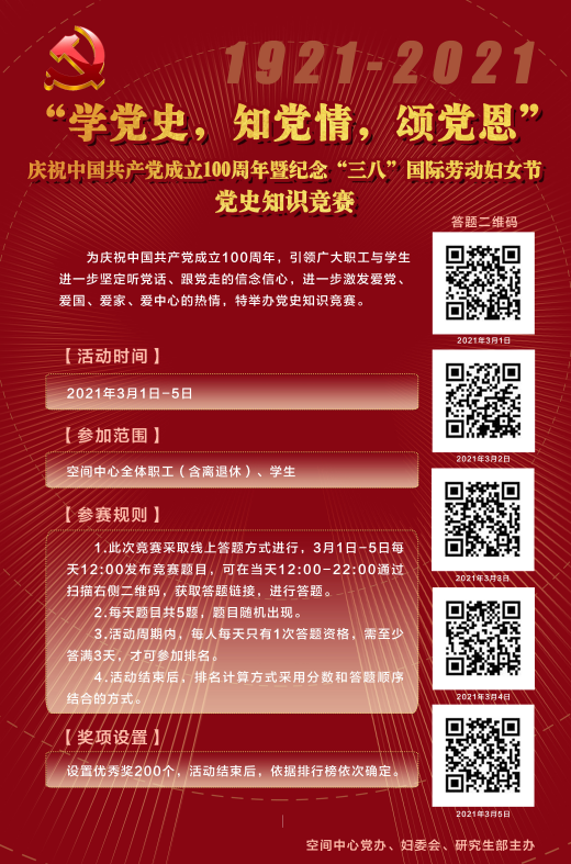 为庆祝中国共产党成立100周年暨纪念“三八”国际劳动妇女节,空间中心妇委会组织中心全体人员开展了“学党史,知党情,颂党恩”党史知识竞赛活动。为了提高大家学习的积极性和参与度,竞赛设计成连续五天答题周的方式,每天在午休时间开放当天的题目,按照答题正确率和参与次数进行排名。竞赛吸引了三百多名职工和研究生参加,大家学习了党史,进一步坚定了听党话、跟党走的信念信心,进一步激发了爱党、爱国、爱家、爱中心的热情。