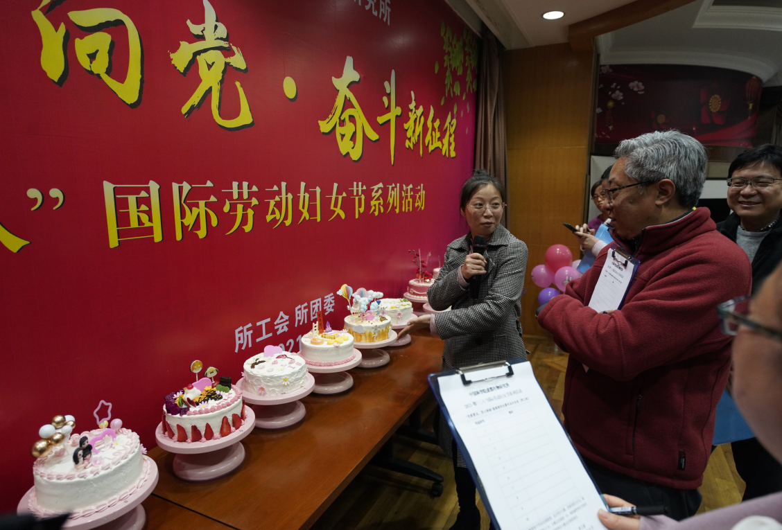 按照院妇委会要求,本次庆祝2021年“三八”国际劳动妇女节系列活动是以“巾帼心向党·奋斗新征程”为主题。经所工会、团委精心策划,我所的庆祝活动一共包括4个环节,分别是:引领·奋斗建功——表彰我所2020-2021年度先进女职工,并邀请3位先进女职工代表围绕“党的女儿话初心”开展交流发言;成长·温暖守护——为每个工会小组赠送1套书籍,其中有党史学习的书籍、有关于女性成长的书籍,愿全所女职工、女同学都能终身学习、终身成长;绽放·技能培训——开展“用爱装点”蛋糕设计比赛,各队以“家和万事兴”为主题装裱蛋糕,象征着家庭和和美美、甜甜蜜蜜,生活蒸蒸日上;传承·家风建设——为每位女职工发放了电影票,大家可以和家人、和子女一起走进影院,助力家庭家教家风建设。