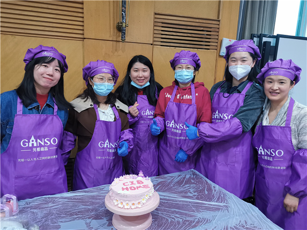 经过一番精心装扮,每个蛋糕原胚都穿上了华丽的外衣,变成了一个个艺术品,有的用饼干做成了一家人的笑脸,寓意一家人相亲相爱,水果围绕在周围,象征着和和美美、甜甜蜜蜜;有的在蛋糕上写着CIB,布置了梯子寓意步步高升,象征着研究所的发展越来越好;有的用红色巧克力和黄色的奶油做成了一面国旗,象征着祖国大家庭,周围花团锦簇、繁花似锦……