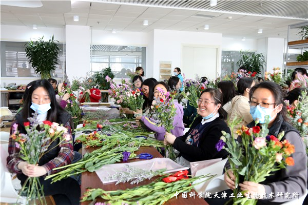 3月3日下午,研究所C220众创空间被五彩缤纷、满室生香的鲜花海洋所淹没。工会女职工委员会组织的插花活动正在此展开。橙白两色的月季、红色的康乃馨、疏落有致的散尾葵、粉白可爱的唐菖蒲、小巧玲珑的丝石竹、挺拔俏丽的勿忘我……各色花朵映着女职工们相互打趣的笑脸,满室欢声笑语。