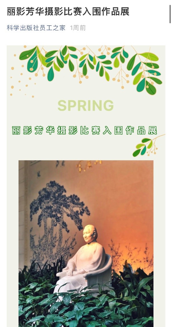 结合参观活动,中国科传工会、妇委会联合摄影协会举办了第十届“丽影芳华摄影比赛”,共350名女职工参加比赛,提交摄影作品1000余张。妇委会、摄影协会在1000余张作品中经过初筛和评选环节,精选出34张照片,在科学出版社员工之家公众号上进行线上展览。