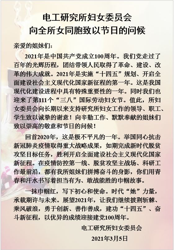 为了庆祝中国共产党成立100周年和纪念“三八”国际劳动妇女节,电工所妇委会以此为契机,为各位姐妹们组织了系列庆祝活动:
