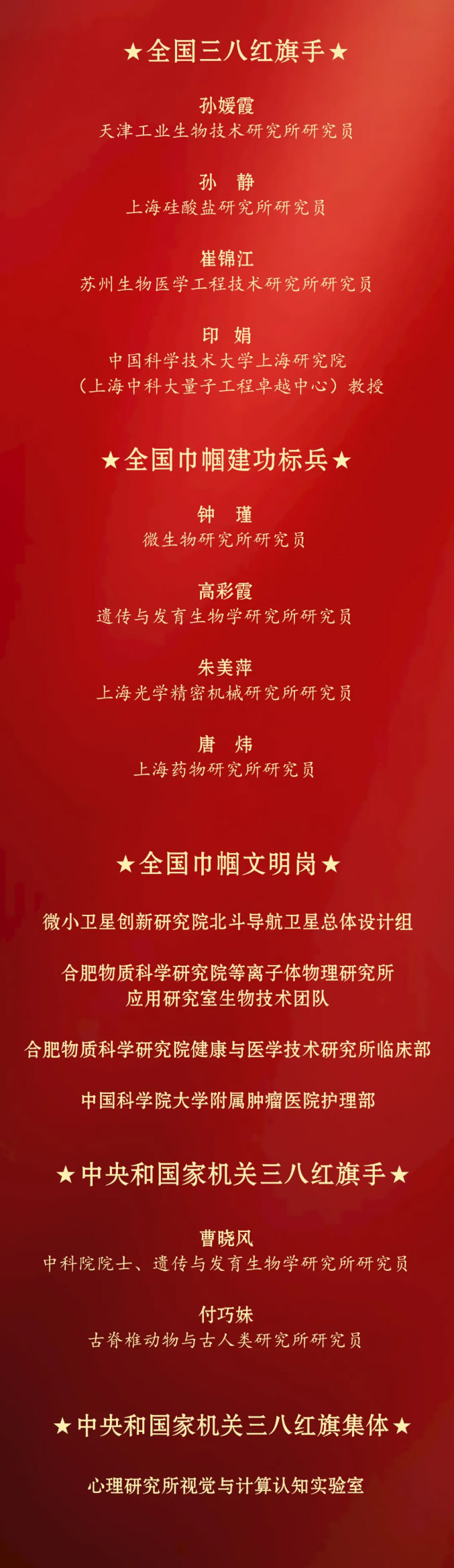 中科院10人、5集体荣获全国及中央和国家机关重要女性奖项