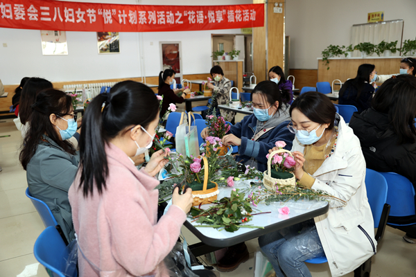 “花语·悦享”,让心灵沐浴花香,绽放“她”魅力。3月8日下午,妇委会在园区组织开展了花艺沙龙活动。所妇委会主任、党委副书记、纪委书记樊志军以及研究所女职工、女博士后200余人参加了活动。专业花艺老师先给大家介绍各种花材、花语、色彩搭配及修剪技巧,并现场演示材料的选择、插花的步骤和心得等。女同志们一边按照老师讲解的方法修剪花枝,一边精心创作作品,零散的花材变成了一盆盆错落有致、色彩绚烂、造型出彩的插花作品。活动现场花香四溢、满庭芬芳,大家与花相伴,享受了创作的愉悦和艺术的熏陶,纷纷表示将以更加饱满的热情投入到研究所科技创新工作中去,绽放新时代女性魅力。