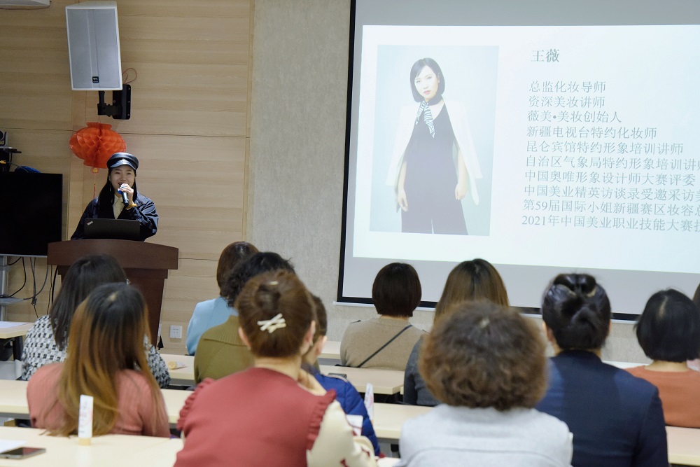 活动邀请薇美?美妆创始人资深美妆讲师王薇讲解皮肤类型分析、护肤品的选择、正确的护肤流程、五官分析、妆前护肤、粉底液和粉底膏的选用和使用技巧、无痕定妆技巧、眉形设计、眼妆修饰技巧分享、五官修饰及气场唇妆、自我简单发型设计,现场邀请所职工做模特进行化妆实操、观摩。此外还讲解服装搭配技巧、体型分类及如何体现不同体型的优势、不同色系如何搭配、依据场合选择得体的服装等等。