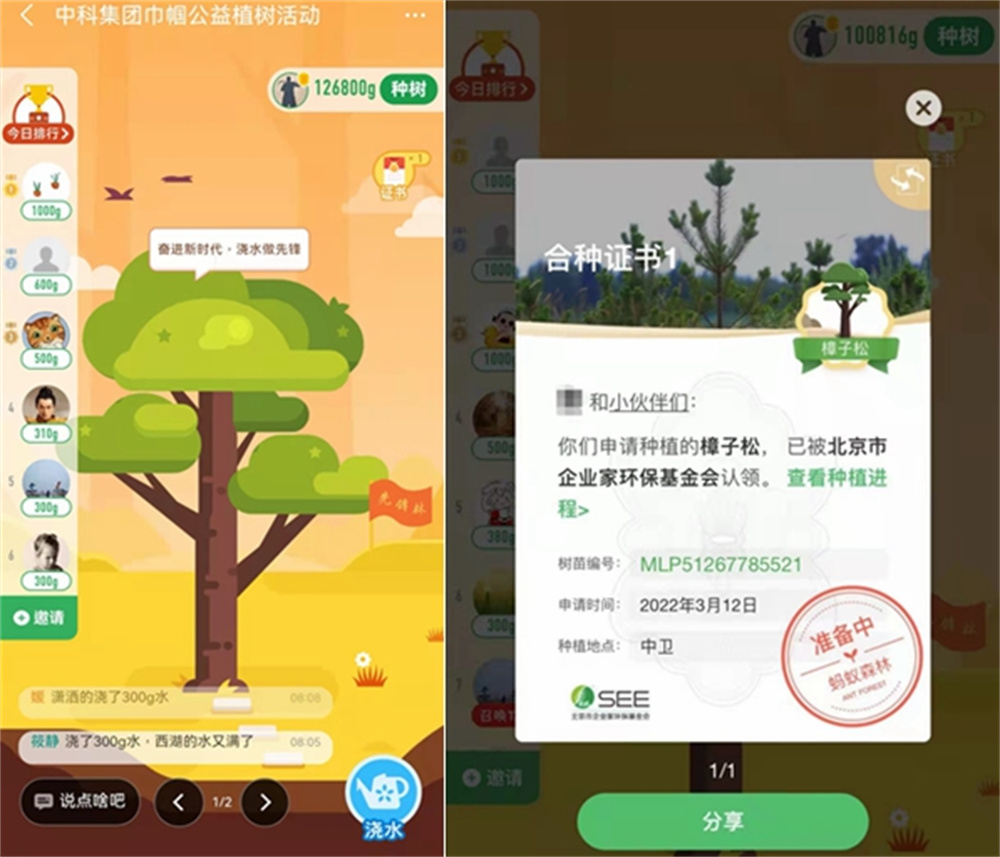 为保护地球生态,倡导环保低碳生活,中科集团总部工会、女职工委员会在支付宝蚂蚁森林平台联合发起“合种一棵树,共创一片绿”公益植树活动。活动得到了近30名职工的积极响应,2月16日至3月12日期间,大家每天通过步行、共享单车、公交出行、在线缴纳水电煤气费、捐赠旧衣等减少碳排放,积攒约30万克能量,在植树节当天合种了一棵樟子松。职工们纷纷表示,将自觉做绿色低碳的倡导者、行动者、示范者,为祖国的绿水青山贡献自己的力量。