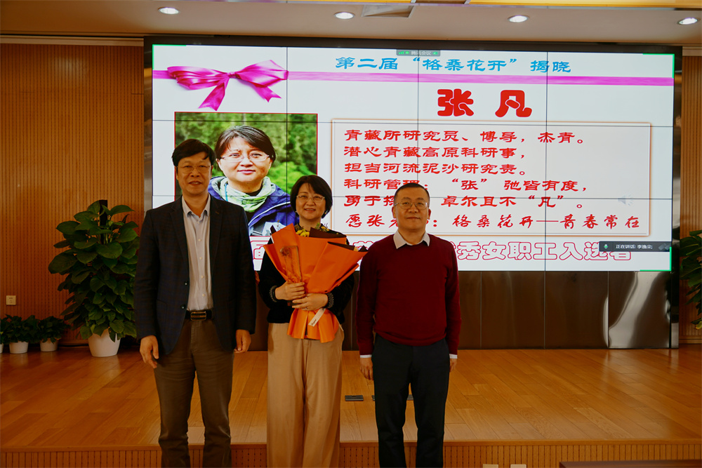 “格桑花开”优秀女职工推选活动是我所“科苑女性活动月”的重点工作。张凡、梁怡欣、燕妮荣获第二届“格桑花开”荣誉称号,他们是研究所科研、管理、支撑人员的优秀代表,充分体现了研究所女性矢志创新的巾帼之美、献身青藏事业的巾帼之志。所长陈发虎院士和党委书记庄绪亮研究员亲临会场,向全体女职工致以节日的问候和祝福,并为获奖者颁发奖杯。