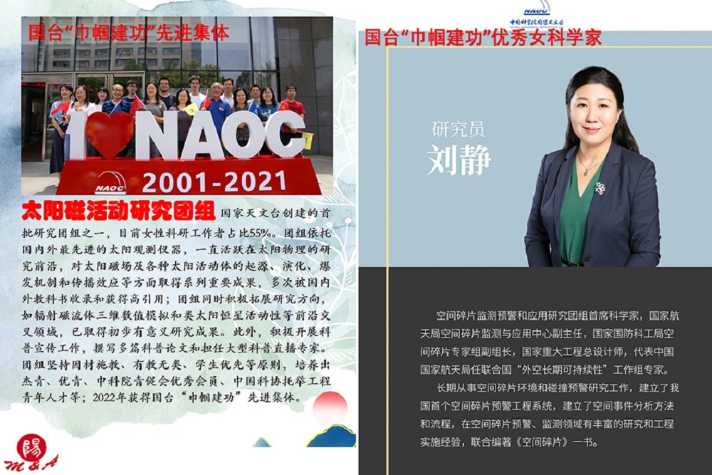 为深入贯彻落实习近平总书记关于妇女工作的重要指示精神,积极响应台党委对我台妇女工作的明确要求,充分发挥先进妇女典型的榜样引领和示范带动作用,宣传表彰在我台“率先行动”计划和创新发展实施过程中涌现出的优秀女性和女性群体,在“三八”节前夕,组织开展了中国科学院国家天文台“巾帼建功”先进集体和“巾帼建功”优秀女科学家评选活动。经报名和评选,有两个集体获得“巾帼建功”先进集体及两位个人获得“巾帼建功”优秀女科学家荣誉称号,将在女职工代表大会上进行颁奖。