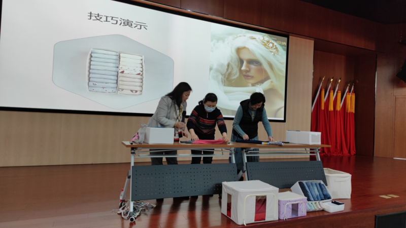 贾琳的报告从收纳的含义、技巧等方面,阐述了收纳是通过重新考虑个人与物品之间的关系,断舍离 “不需要、不合适、不舒服”的东西。以此来了解自己,整理自己内心的混沌,让人生更舒适的行为技术。并现场教授了日常的衬衫、毛衣、牛仔裤的折叠方法和技巧,现场女职工积极参与叠衣服大比拼,气氛活跃。