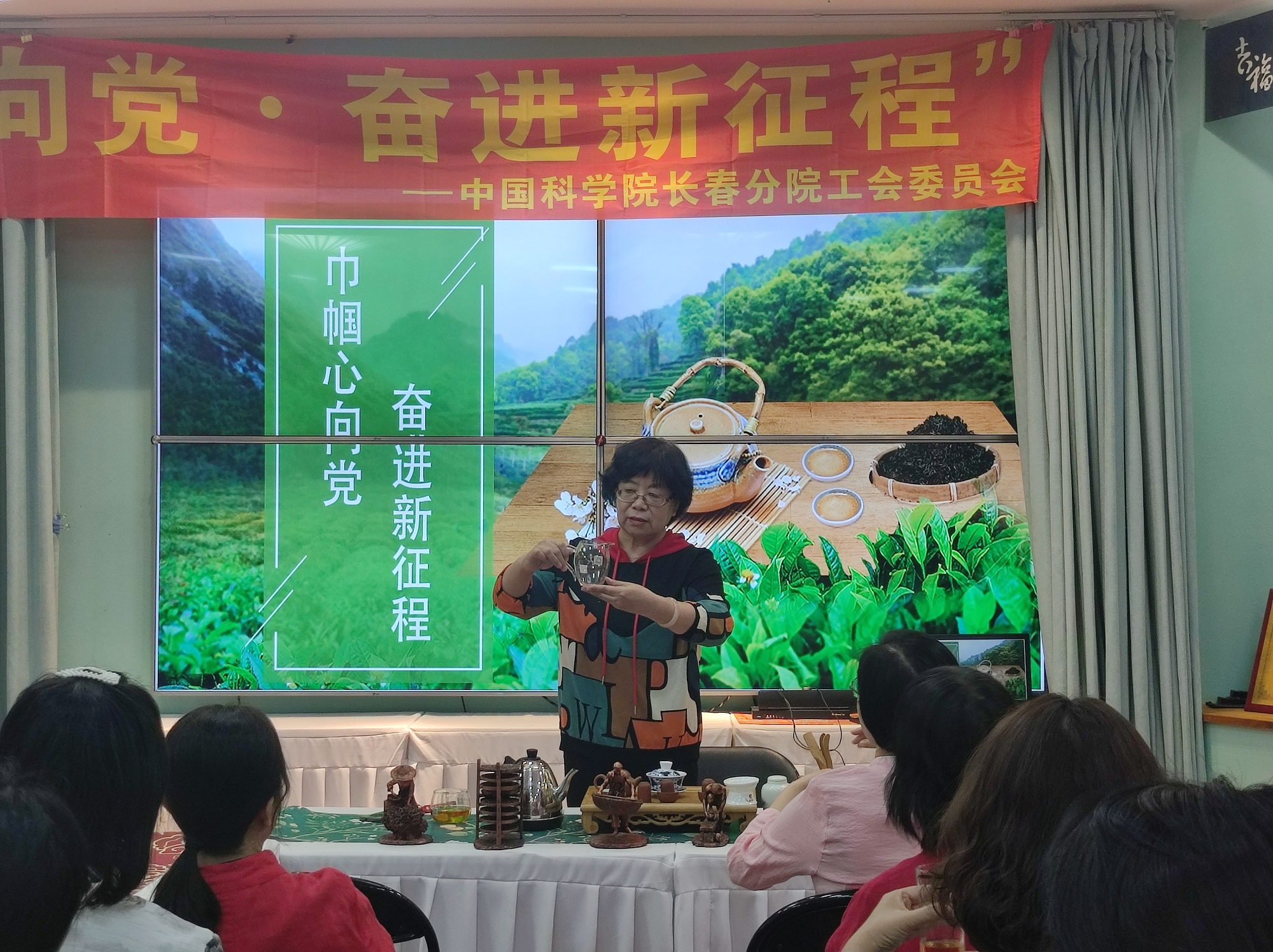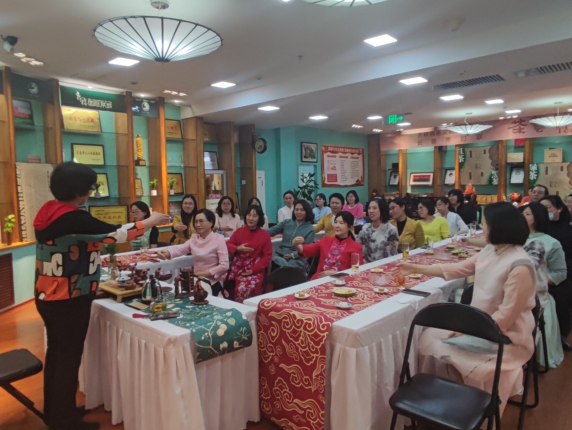随后,吉林省茶文化产业协会秘书长、国家级茶艺高级技师赵金荣为大家现场授课,她围绕着中国茶文化的起源与发展历史,从中国茶的分类、制茶的工艺以及茶的功效与作用等带领大家领悟了中国传统茶文化的魅力,并现场向大家传授了基本茶礼、茶道,勉励大家做懂礼、知性、优雅的新时代女性。伴随着轻缓的乐律和悠悠的茶香,大家一边学习中国传统茶道礼仪,一边惬意举杯品茶交流,识茶趣、品茶韵、悟茶道,在一提一放之间感受传统茶文化的魅力,共度了“一杯茶”的美好时光。