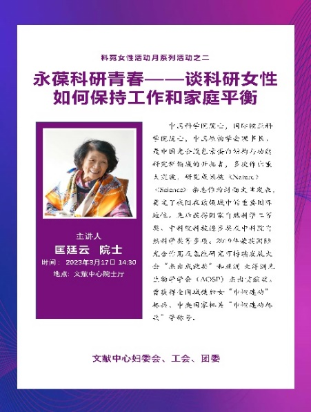 3月17日下午,文献中心邀请中国科学院院士,植物研究所研究员匡廷云作了题为《追“光”的人》的报告。文献中心50余名女科技工作者参加了本次讲座。