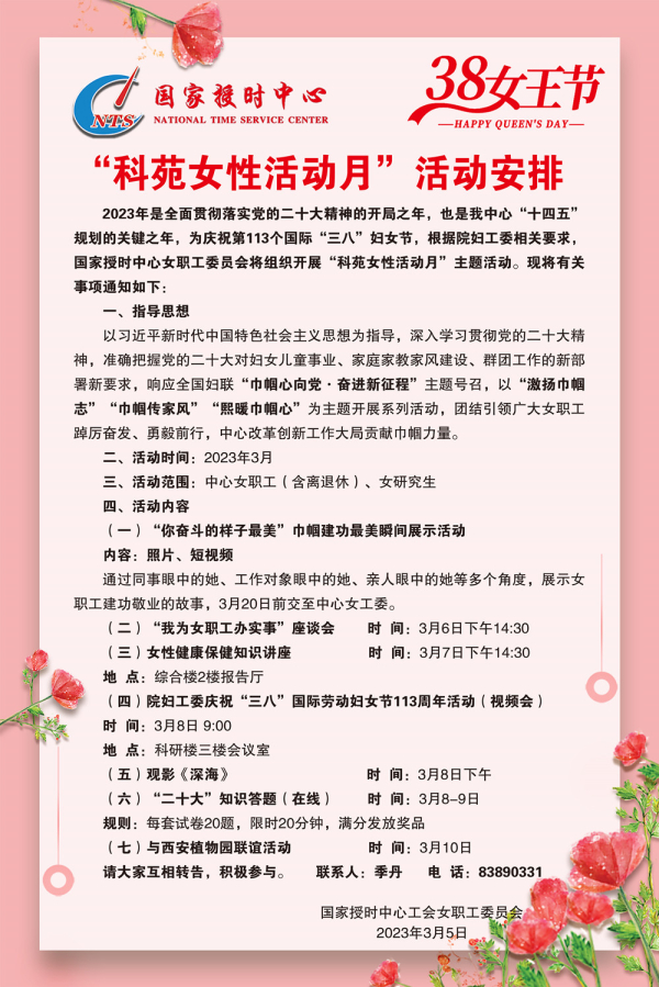 为庆祝第113个国际“三八”妇女节,动员广大女职工践行新思想、建功新时代、展现新作为,根据院妇工委相关要求以及研究所实际,国家授时中心工会女职工委员会组织开展了系列“科苑女性活动月”活动,活动受到了党委和工会的大力支持,既愉悦了广大女职工身心,也为研究所创新文化建设起到了积极的促进作用。