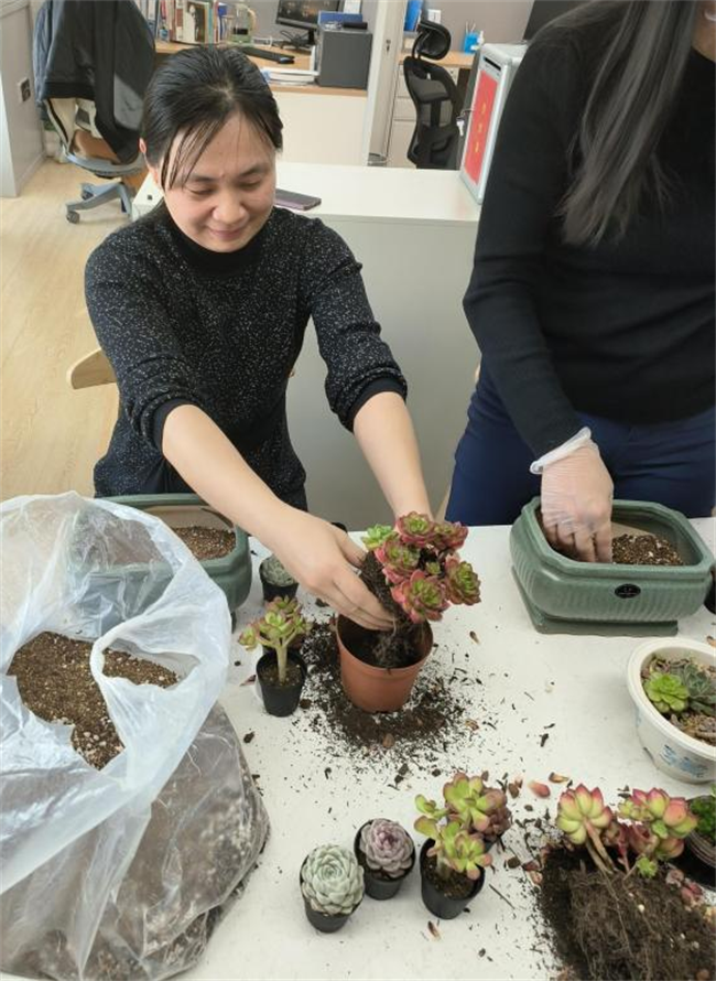 活动现场气氛温暖、热烈,大家洋溢着快乐与喜悦,女员工积极分享了插花和养花心得,并亲手栽下了属于自己的花艺作品。