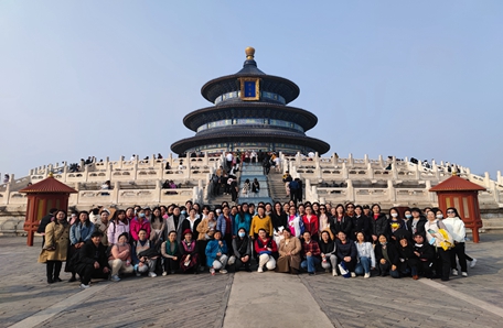 天坛公园是明清两代皇帝每年祭天和祈祷五谷丰收的地方。一进大门,置身于辉宏的古代建筑群,目不暇接地欣赏人文建筑“天人合一”之美,认真聆听中华文化传统讲解,大家无不被天坛严谨的建筑布局、奇特的建筑构造和瑰丽的建筑装饰所折服,在赞叹古人的大智慧之余,还亲身体验了回音壁的传音奇趣。