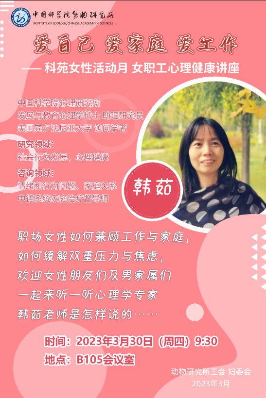 3月30日上午,动物研究所邀请心理研究所韩茹老师作题为“爱自己 爱家庭、爱工作”的女职工心理健康讲座。