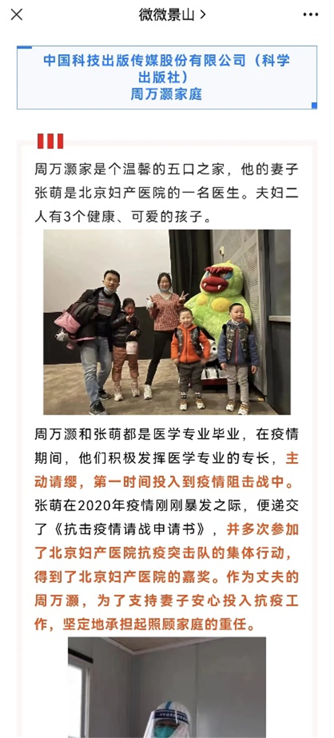 我社周万灏家庭事迹材料获“东城区最美家庭”称号并在“微微景山”公众号进行发布。