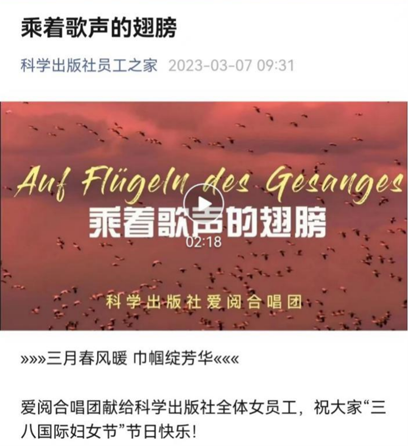 科苑女性活动月期间,组织爱阅合唱团女声高声部和低声部20余人录制合唱《乘着歌声的翅膀》并制作MV于三八妇女节当天在“科学出版社员工之家”视频号发布,为三八献歌,祝福出版社全体女员工节日快乐。