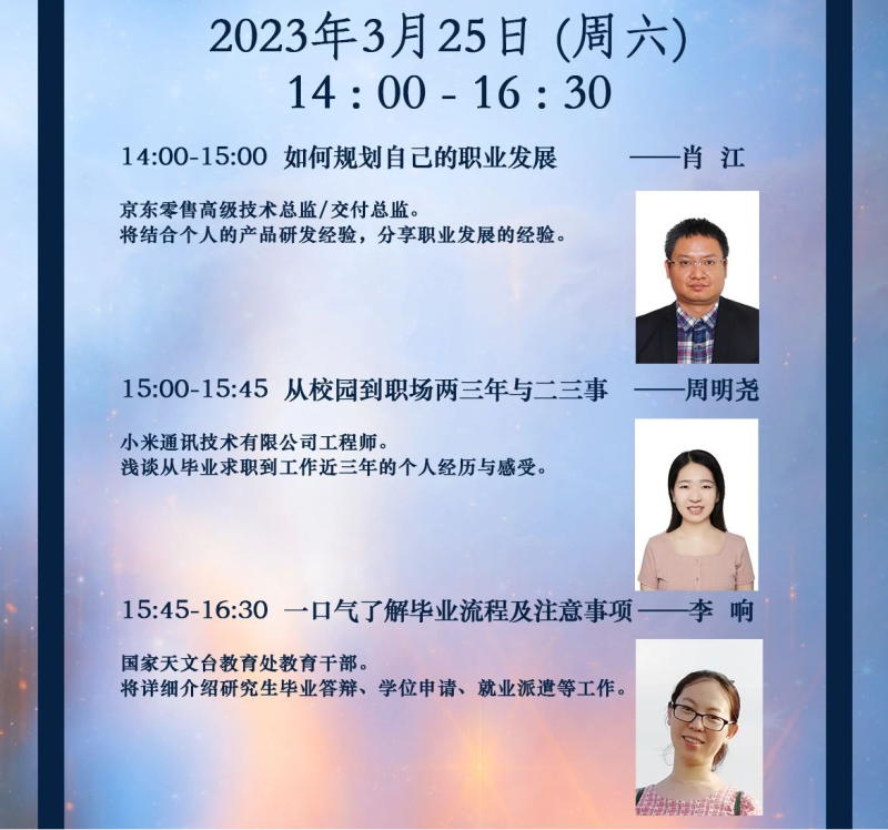 为了进一步做好我台毕业生就业工作,切实履行好培养单位的主体责任,国家天文台于2023年3月25日举办了研究生就业经验分享会。本次分享会邀请到了国家天文台两位优秀毕业生为同学带来了关于职业发展及学校到职场身份转变的感受等主题的精彩分享报告。国台教育处也为同学们做了关于毕业流程及相关注意事项的报告,帮助同学更好的了解毕业相关事宜,做好毕业以及就业的规划。其中两位主讲人为国台女性优秀毕业生。