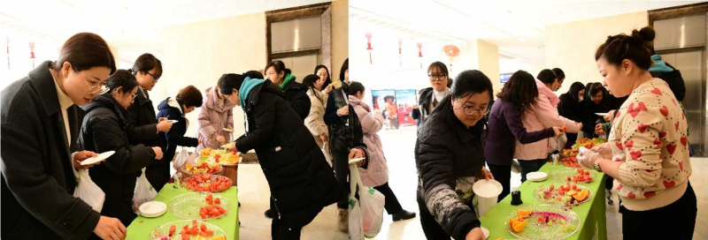 新科研楼大厅里的水果品鉴会为大家增添了味蕾上的享受,一盘盘色彩鲜艳、新鲜美味的水果摆满长桌,大家围在长桌前欢快地品尝着种类丰富的水果,或回味刚才的活动,或轻言细语谈些有趣的事情,轻松解压,幸福感、自豪感油然而生。