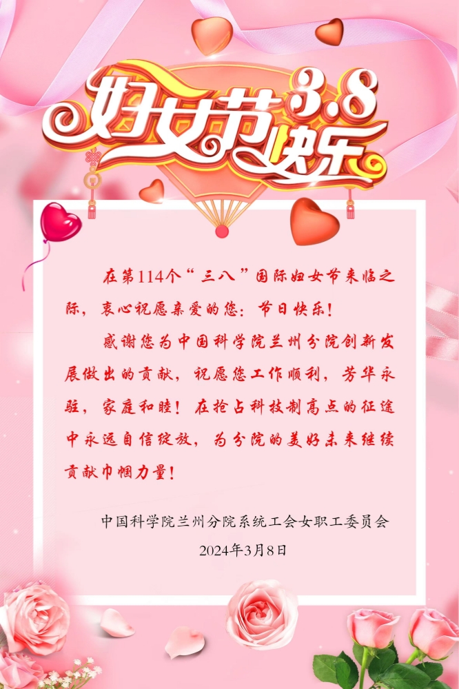 分院分党组、系统工会利用“科兰党建”微信公众号发布节日寄语致敬系统全体女职工的默默奉献付出,通过中国科学院电子邮箱于3月8日9点38分发送电子贺卡祝系统全体女职工、女同胞节日快乐,并勉励鼓舞大家继续发挥光热能量,展示巾帼担当,上下同心、团结一致,以优异成绩迎接新中国成立75周年和中国科学院建院75周年。