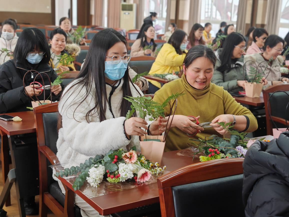 花艺老师向大家详细讲解了插花的技巧和各种花卉的花语,并现场进行了插花示范。平日忙碌的女职工此刻静下心来,一边听老师讲解,一边修剪花材,用自己灵巧的双手整枝搭配色彩,设计造型,创造出一件件美丽的花艺作品,在馥郁花香中感悟自然之韵,领悟生活之道。