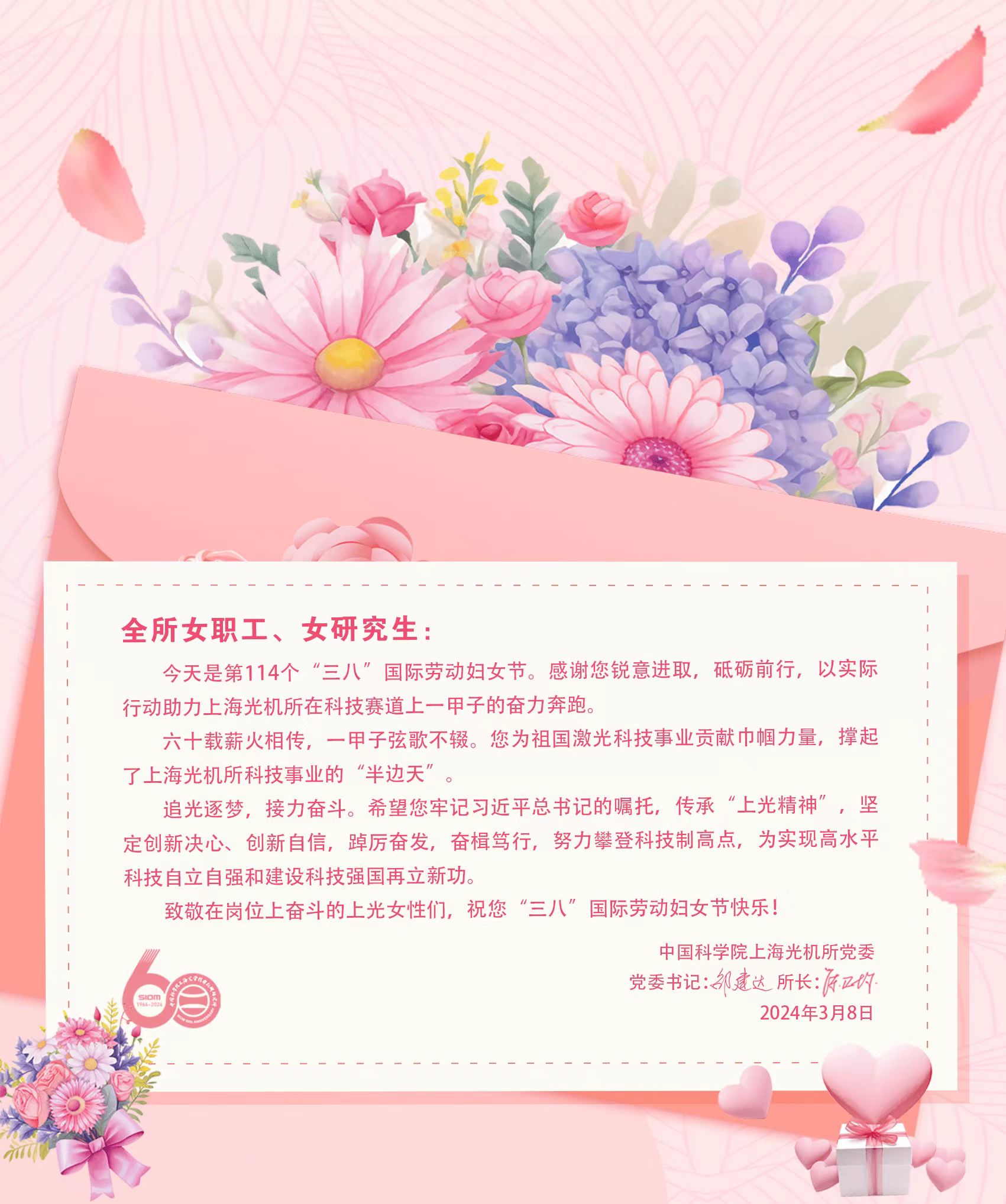 在“三八”国际妇女节到来之际,上海光机所党委书记邵建达和所长陈卫标通过邮件方式,向全所女职工和女研究生送上党政班子最诚挚的问候与祝福,感谢大家在研究所发展和抢占科技制高点任务中发挥的重要作用。