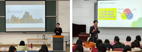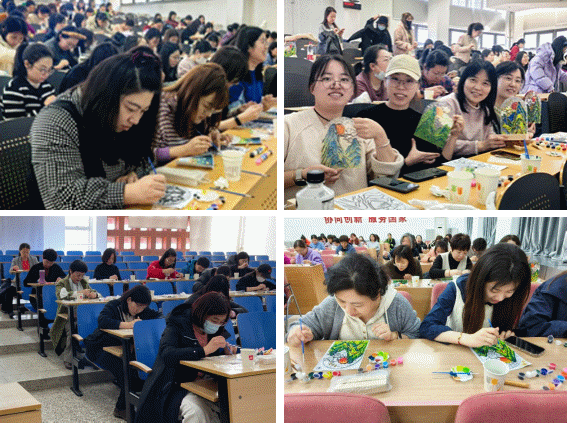中关村校区的活动由经管学院与公管学院承办,妇委会主席刘红雨主持。活动邀请了中央美术学院教师现场指导,以世界名画为引,深入浅出地讲解了色相、明度、纯度等色彩基础理论以及配色原理。在老师的示范指导下,大家用自己的审美和艺术设计能力,创作出了富有个性、色彩纷呈的“千里江山图”。