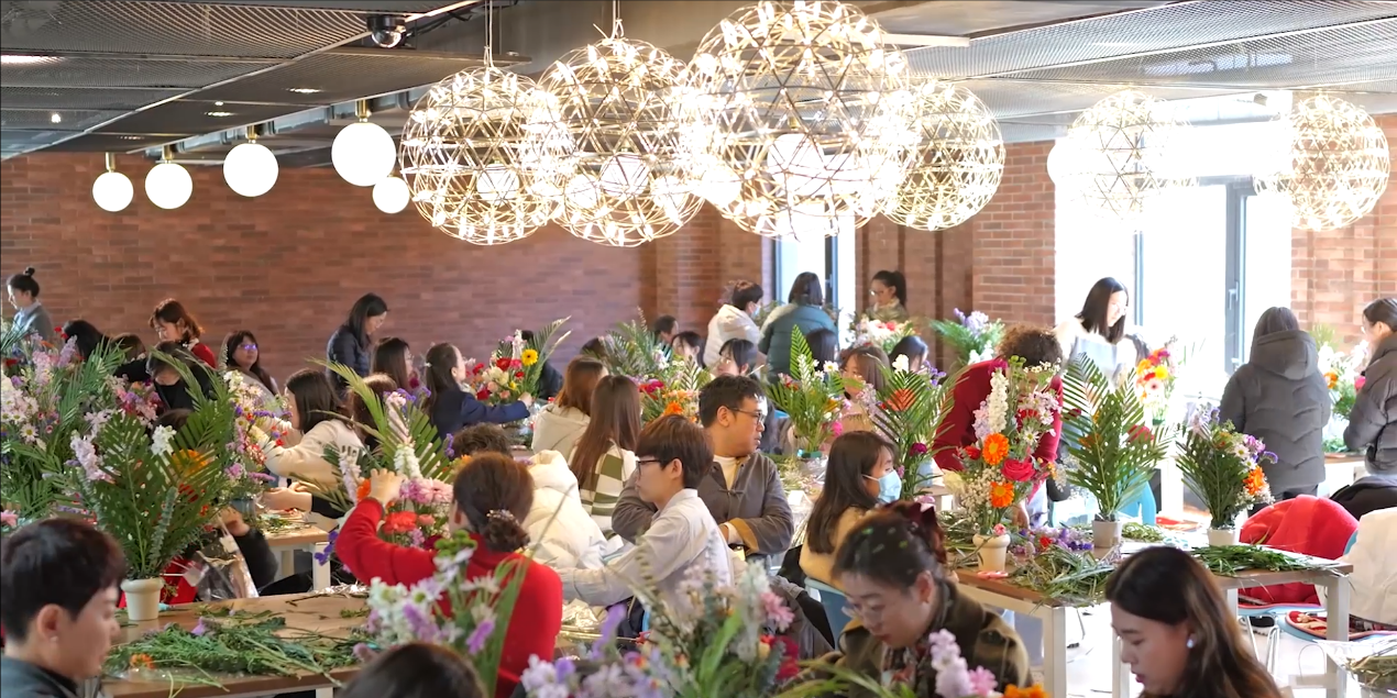 参观结束后,花艺师带领大家体验了室内插花,她讲解了花材花语、鲜花养护知识、色彩搭配规则、修剪要领和扦插技艺等……一朵朵百合、玫瑰、康乃馨、勿忘我等花材,经过大家的创意组合,组成了一盆盆形态各异,象征着祝福与美好的艺术作品。