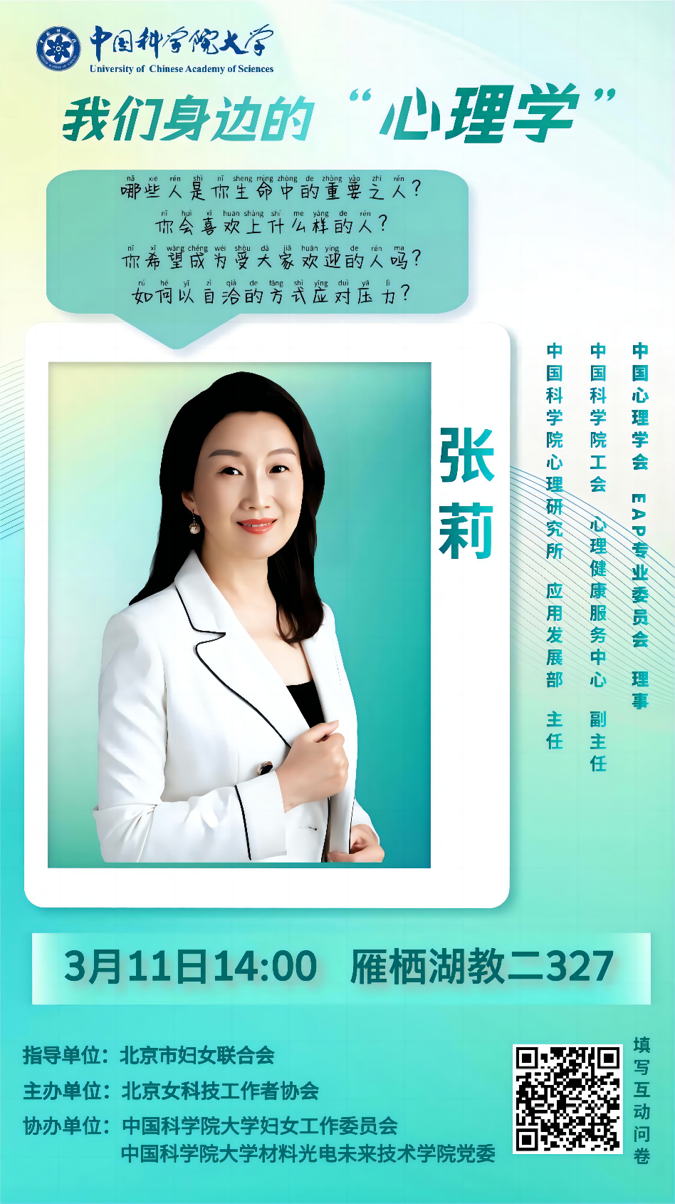 为了促进师生的自我认知和人际交往技巧, 3月11日,《我们身边的心理学》讲座于雁栖湖校区举办。该讲座由中国科学院心理研究所应用发展部主任张莉主讲,国科大材料科学与光电技术学院书记张举主持。