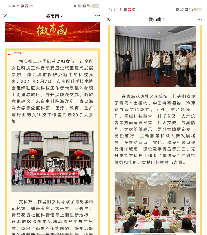 为庆祝三八国际劳动妇女节,向女性科技工作者代表致敬,进一步凝聚女性科技工作者献身科技的力量,海洋所推选1名女科技工作者代表参加市南区科协组织的中山路历史城区参观活动,让全区女性科技工作者感受历史城区复兴发展新貌,体会城市保护更新中的科技元素,并开展座谈交流,引领女科技工作者充分发挥“半边天”的独特优势和作用,贡献巾帼智慧与力量。