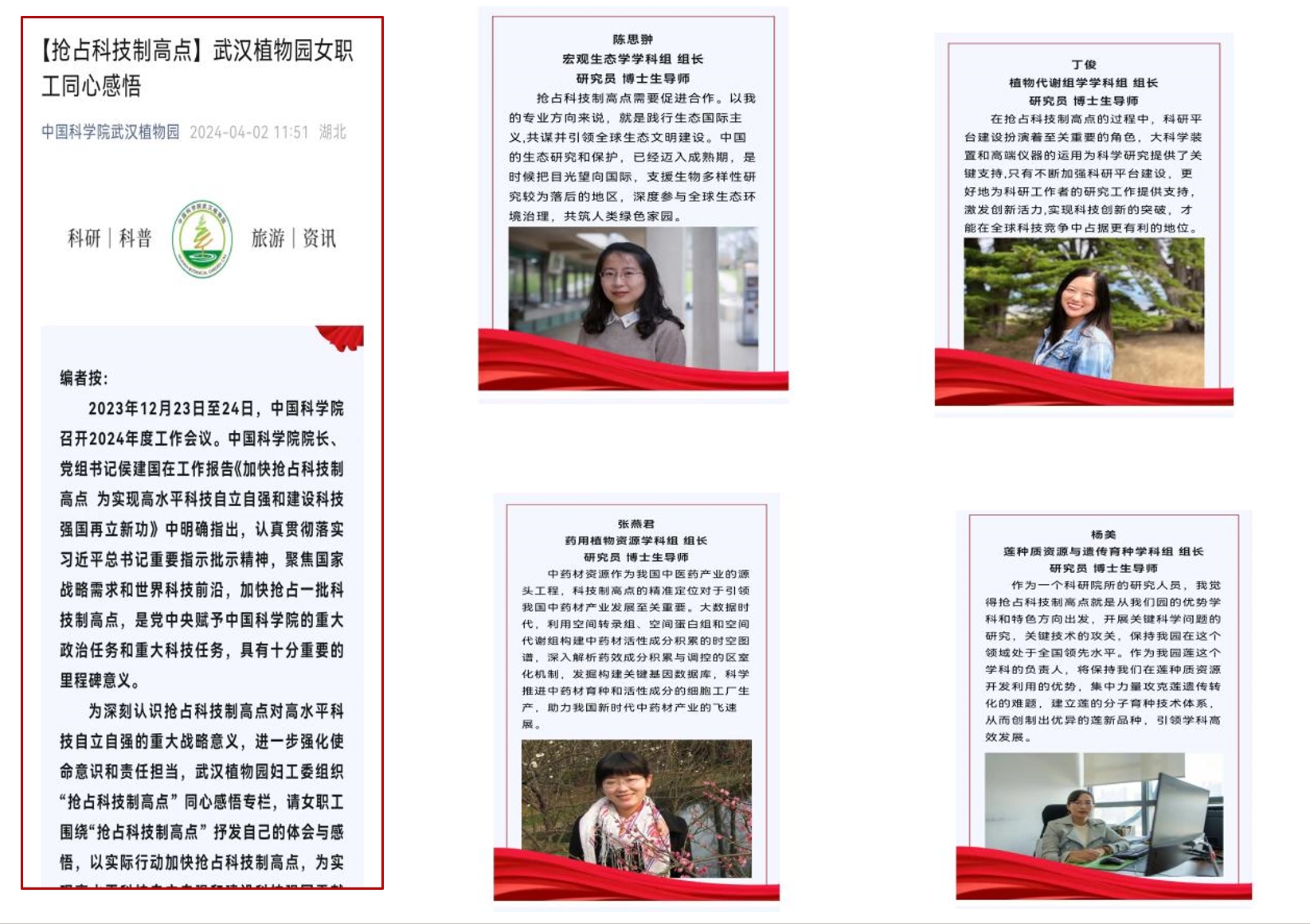 为深刻认识抢占科技制高点对高水平科技自立自强的重大战略意义,进一步强化使命意识和责任担当,武汉植物园妇工委同步在官网、微信公众号平台策划创建“抢占科技制高点”同心感悟专栏,请女职工围绕“抢占科技制高点”抒发自己的体会与感悟,以实际行动加快抢占科技制高点,为实现高水平科技自立自强和建设科技强国贡献自己的力量。园近20位女性学科带头人、研究员、部门负责人及一线职工参与,进一步激发了女职工投身科技创新事业的使命感和责任感。