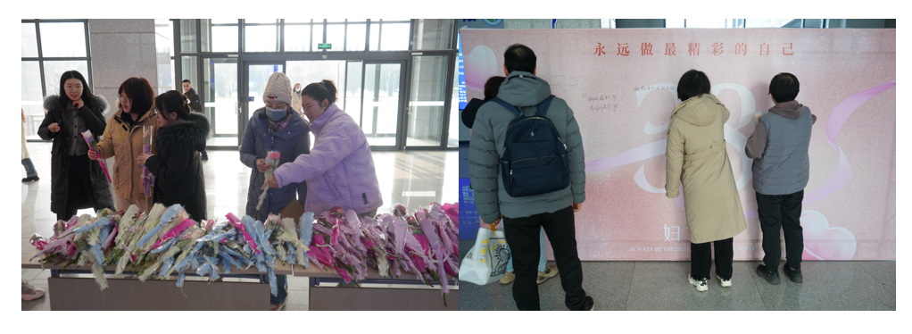 3月8日早上,在办公楼一楼开展了“永远做最精彩的自己”留言展板活动,女职工们来到展板前写下自己的心愿,有祝愿国富民强的、有祝愿家人健康的、有祝愿工作顺利的、有祝愿幸福满满的,这些心愿朴实又真诚,在写下愿望的同时,每位女职工脸上都洋溢着喜悦期待的笑容。综合楼大厅还为大家发放娇艳欲滴的郁金香、玫瑰花和康乃馨,每个人都可以挑选自己心仪的花束,开启节日浪漫的一天。