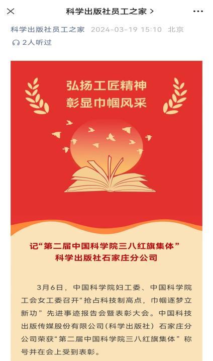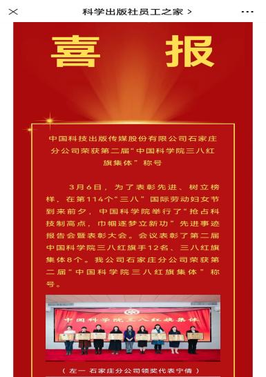 1.我社石家庄分公司荣获“中国科学院三八红旗集体”称号,在公司“科学出版社员工之家”公众号进行同步报道。