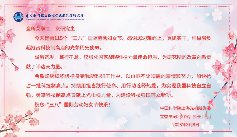2025年是“十四五”规划收官、“十五五”规划谋划之年,也是上海光机所抢占科技制高点的关键之年。为了隆重庆祝三八国际劳动妇女节,上海光机所妇委举行了系列主题活动,为研究所抢占激光科技制高点贡献巾帼力量。